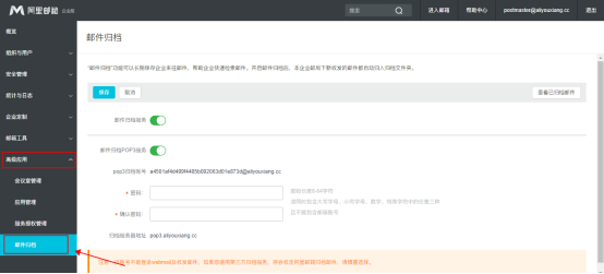 管理員可以在該界面開啟郵件歸檔pop3賬號服務及設置密碼,用于第三方歸檔服務,該賬號無法登錄webmail及收發郵件。